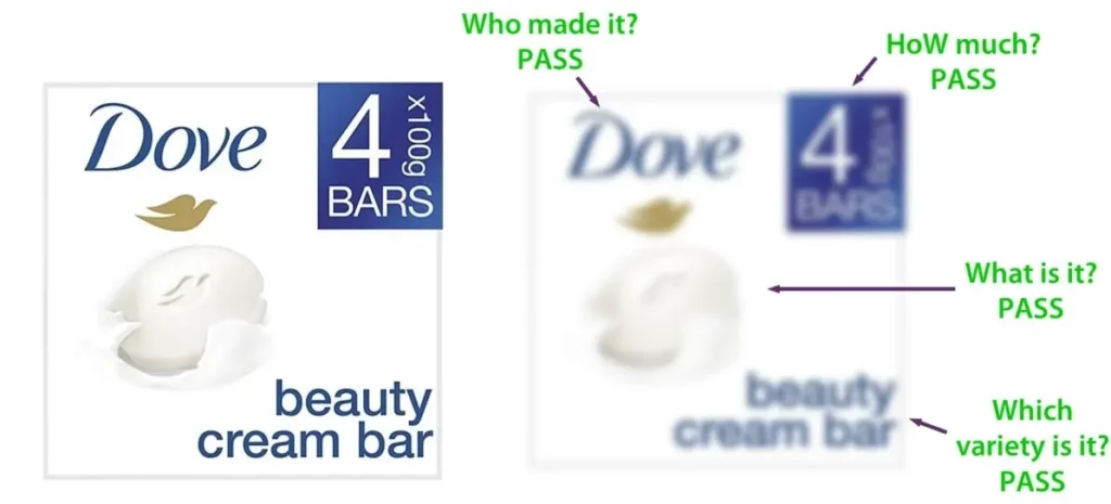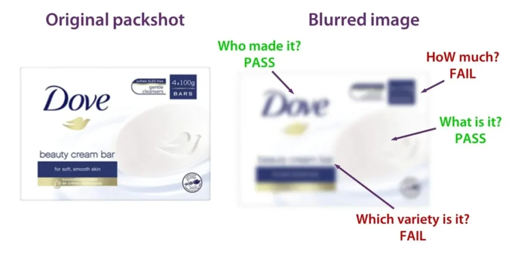 We’ve got a package of Dove soap. In the original packshot, we can clearly see that there are elements on the packaging that are quite small. When we blur the image, they become impossible to see. Some elements are still visible, like the “Who” (Dove) and the “What” (Soap), but “How” and “Which” fail the test.